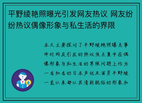 平野绫艳照曝光引发网友热议 网友纷纷热议偶像形象与私生活的界限